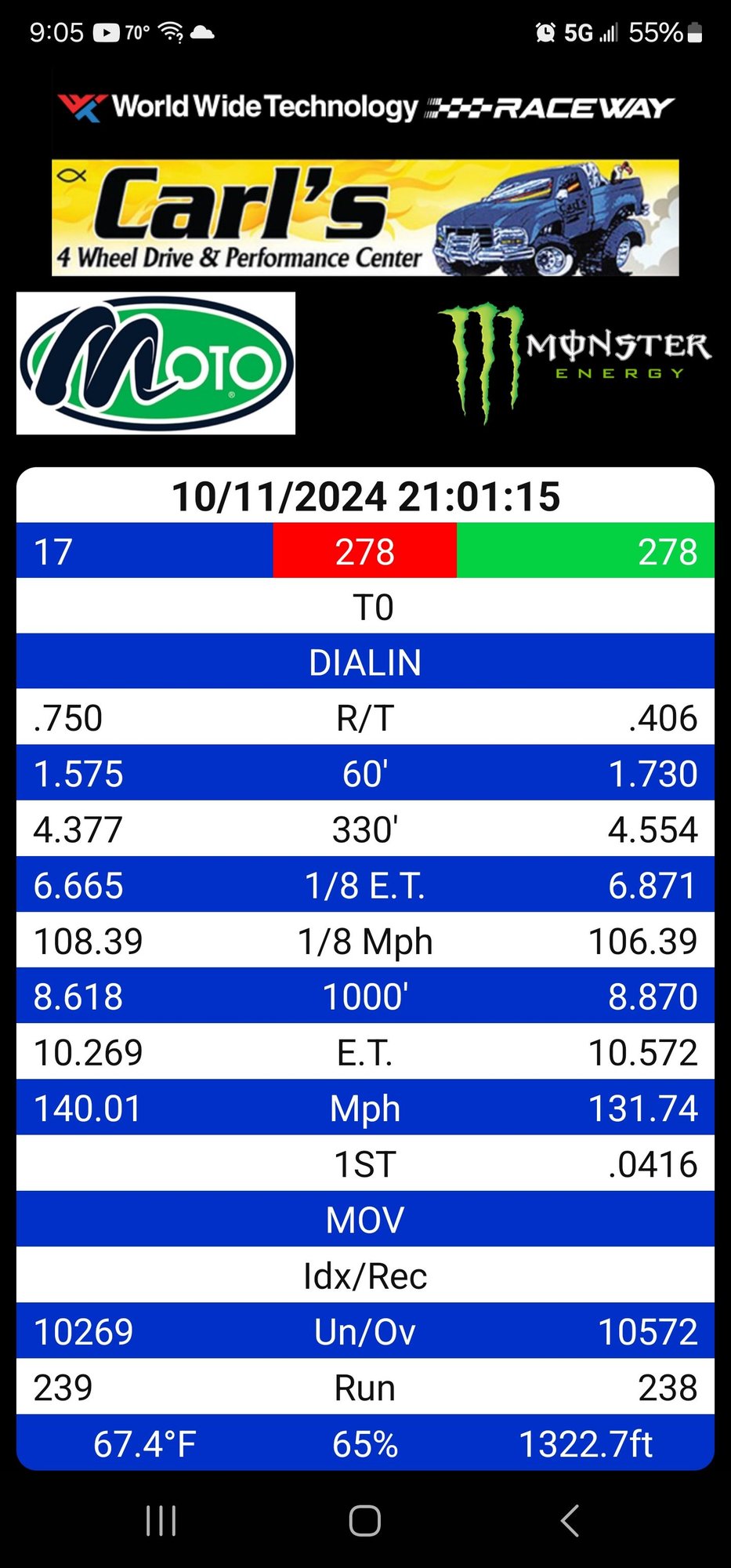 I was fighting traction issues all night. Best i could 60ft was a 1.73 spinning in 1st gear at part throttle. When it shifted into 2nd gear it would spin more. On the data log it showed, top of 1st gear at 48mph, it shifting into 2nd and the mph dropping back down to 36mph.