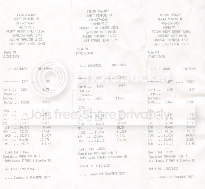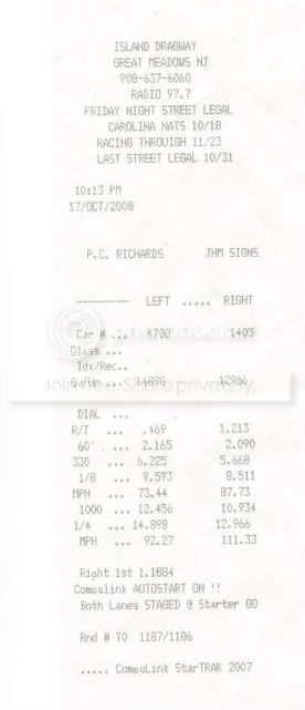 I actually got a total of 10 passes in that night. My very first run was a 13.3 @ 110 with a 2.3 60ft. Doo doo. I followed that up right after with a 13.09 @ 110 with a 2.1 60ft. Then the rest of the night seemed to filled with low 13 second runs. I wanted 12's really bad. After my friends had started to pack up for the night, i decided to take one more run. I got a decent launch his time and i hit my goal. The very last run of the night. 12.96 @ 111. I cut a 2.0 60ft on this one. I was pretty excited.