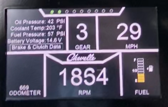 I have a 1966 Chevelle that I have built, I have a blue print engines LS3 using a GM performance controller kit with the tune done by blue print engines. The electrical system in the car outside of the engine control has all been developed by myself using Arduino micro controllers. I currently have a screen displaying the following;