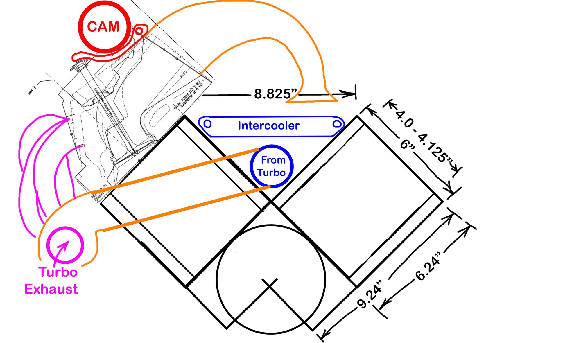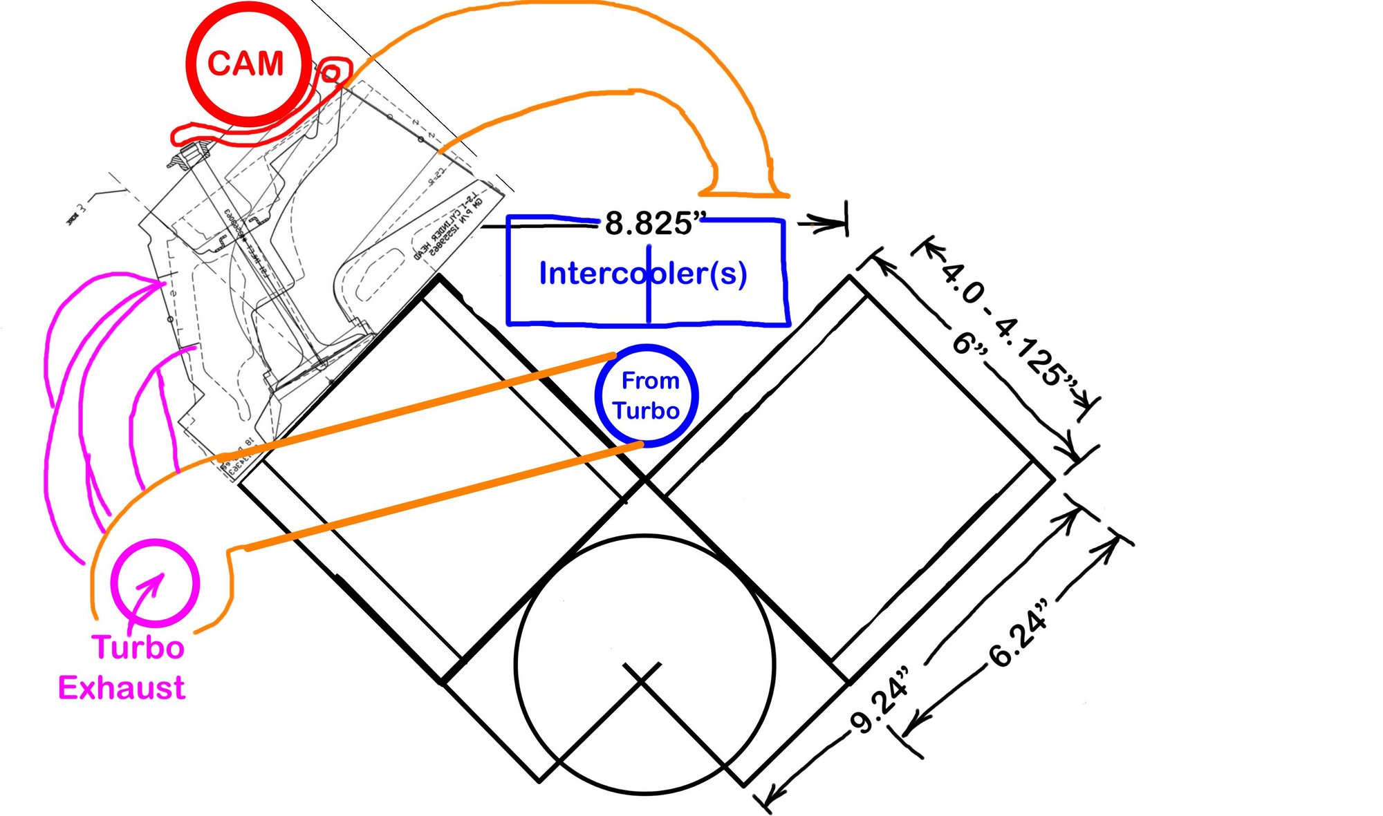 I didn’t spend much time looking, but I found an intercooler core size: 9.25"L x 3.5"x 3.5" in the first few minutes of looking. I could LITERALLY fit four of those in the V space.