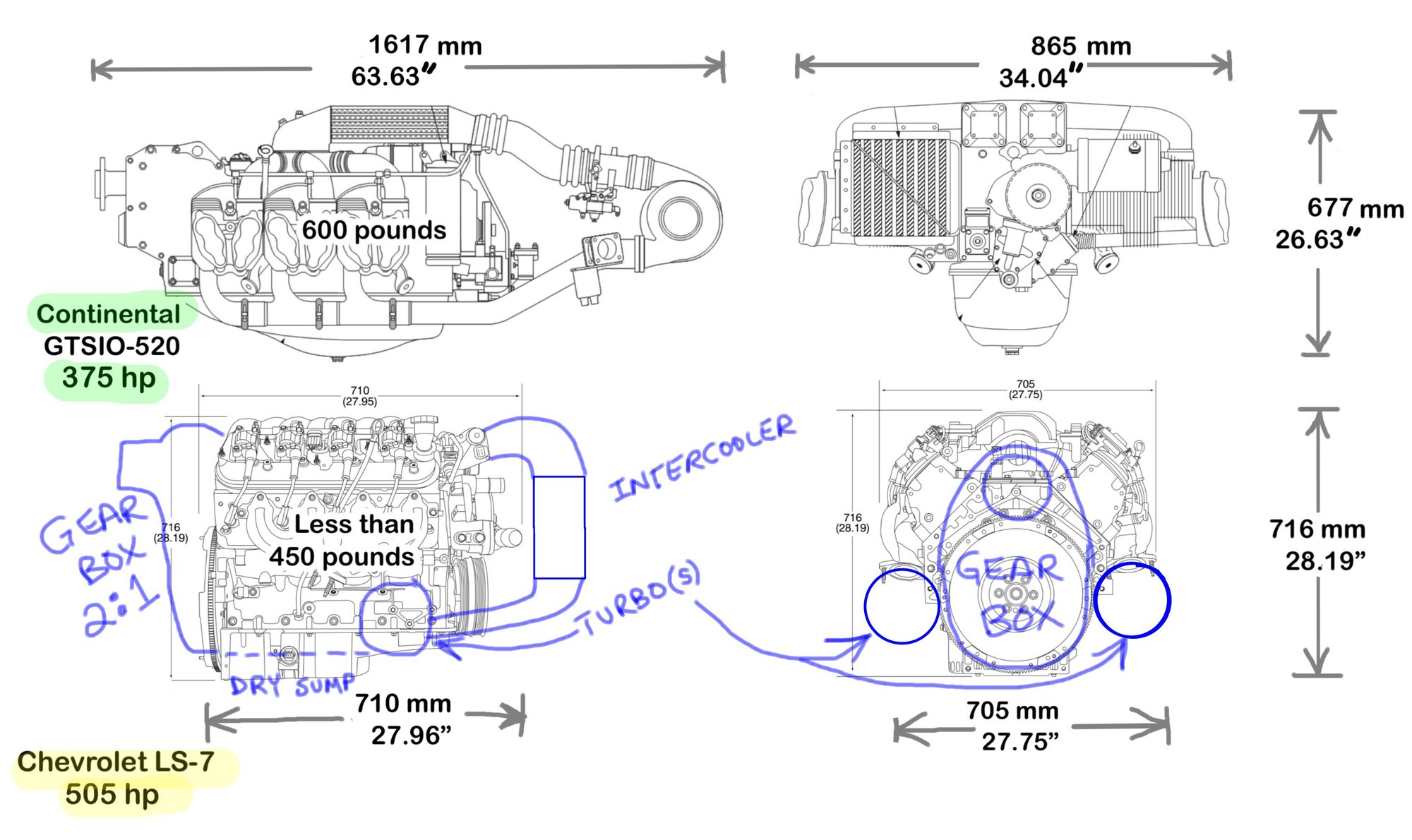 if your looking for something compact, and your willing to twin turbo this thing, I’d look a different direction and consider GM’s 2.5 liter I4 LCV aluminum inline 4. It’s durable, reliable and would respond wildly to twin turbos. You won’t need the 7k rpm in a prop aircraft, and I don’t think you’d have to spin it that high to make good power…. but then again, the LT6 will spin 8K rpm…again that won’t work with props. Its super lightweight and very compact. Just throwing you an option across the table.