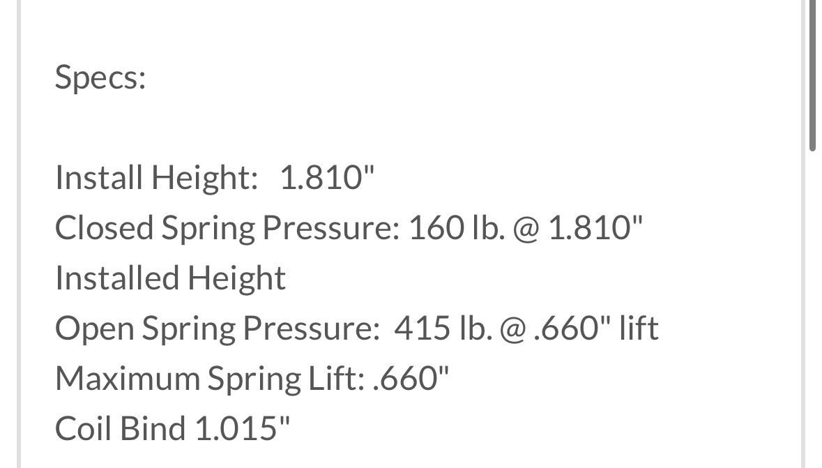 These are texas speed springs and they have told me I will be fine at 1.81 install height. In fact Derek told me on the phone yesterday to get it as close to 1.81 as I can. I got very specific and asked about valve control at 7000RPM and he said not to worry about it. But every hot rod magizine, web page and youtube says otherwise. IM watching weingartner, powell cams and othres who konw their ****. Im sure TSP knows what they are talking about too..