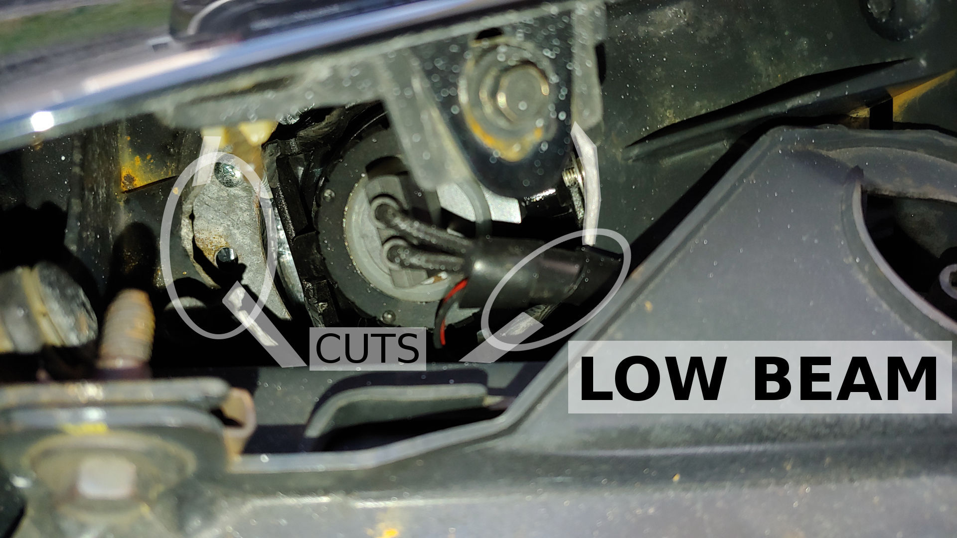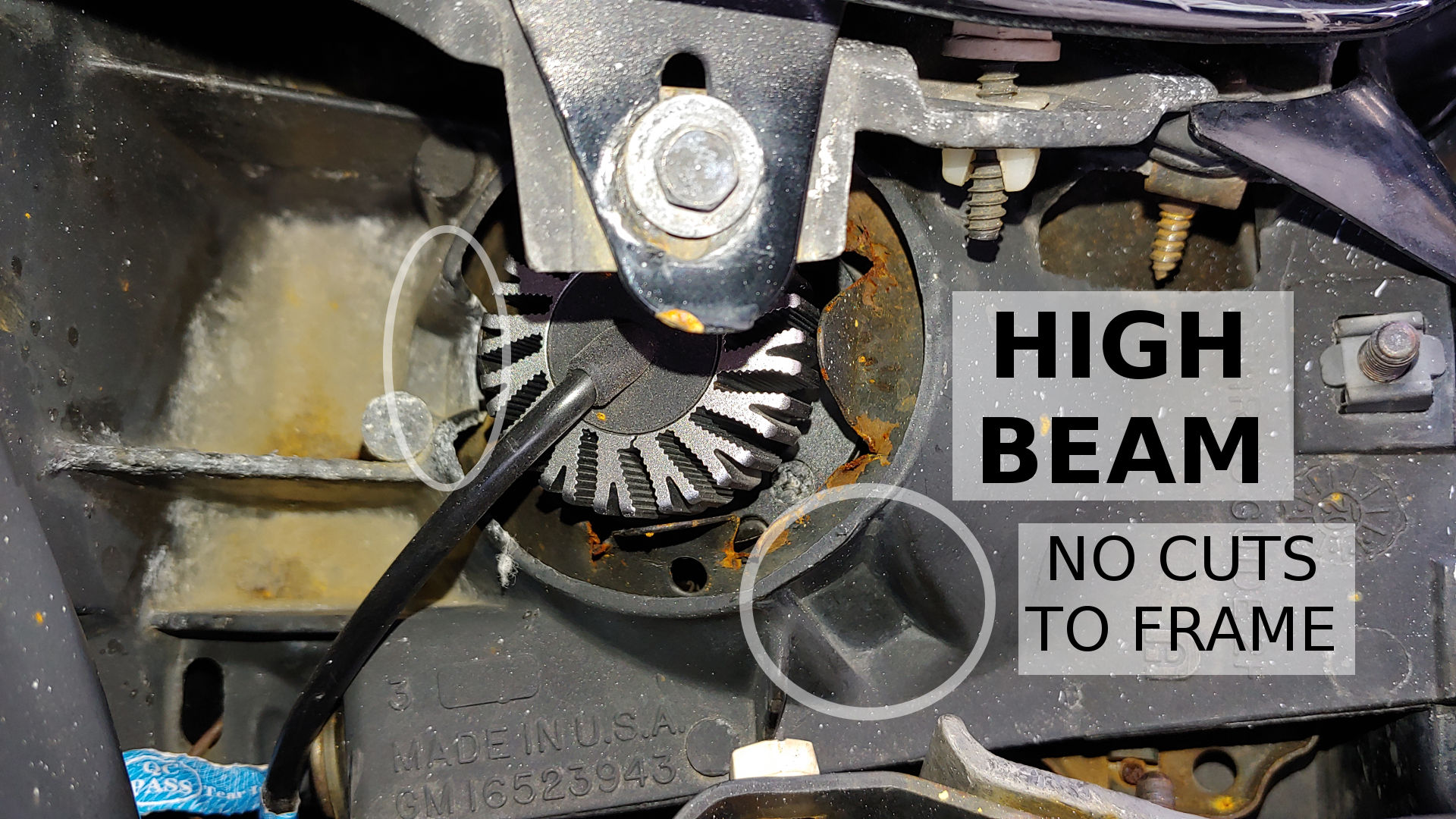 Here is a pic of the Low Beam frame and the High Beam Frame. These are current pics showing the Sinolyn Projectors (not the Hella 90mm that needed these cuts). I highlighted the cuts on the Low Beam frame and showed a pic of the High Beam frame as an example of what the frame looked like before being cut. I think there were 3 or 4 bumps on the Low Beam that I originally cut off. The Low Beam and High beam are different, but these are the closest pics I can take right now. Just use this as an example. If you go with the LMC Truck Housings and LED bulbs, you don't need to cut the frame. Just some small slits and bends in the bucket/holder that I show in the other thread.