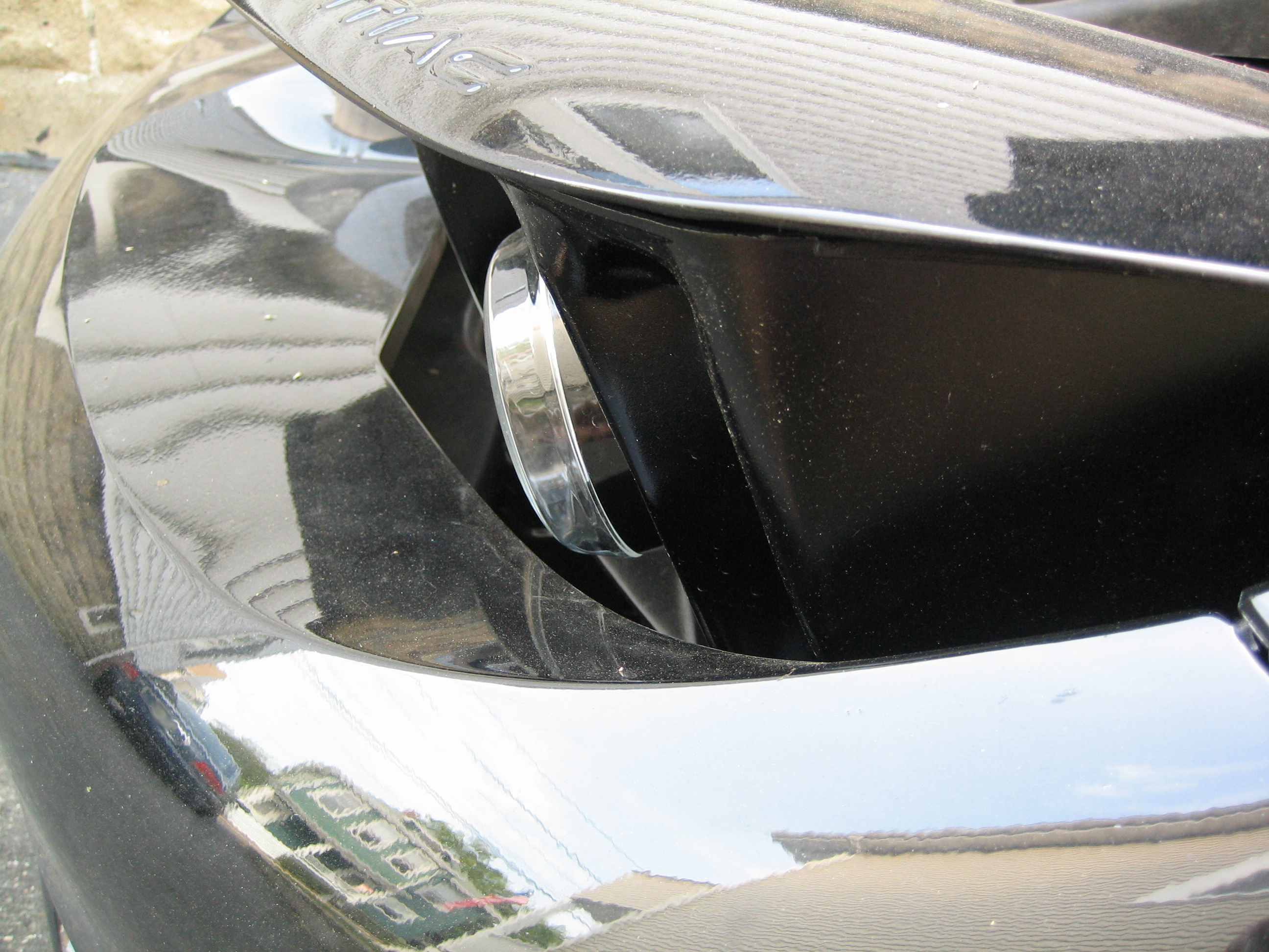 The overall shape is still a triangle with tabs just like the stock shields, but they are now curved. The center curves towards the bulb and the sides curve away. Its a fairly uniform curve (I think I bet the sides a little more though). The final shape puts the side tabs about a quarter inch or so away from their stock mount. As a result, the side screws are no longer used to secure the sides of the shield. Only the bottom screw is used to secure the shields. Hopefully this is enough. Time will tell. So as not to lose any of the screws, I still installed the side screws in their original location (they just aren't being used to secure anything).