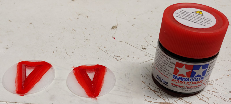 Here is part way through painting the arrows on the final version of the **** faces. The red paint is Tamiya Transparent Red. I wanted something I could brush on to only paint the arrow red and not the whole disk.