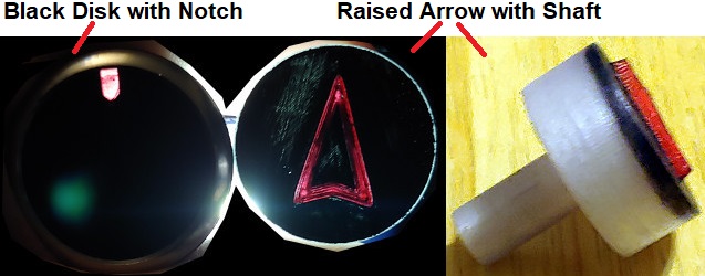 Here are the different prototypes I tried. I tried plain black with a notch or ring to pass light through. I've tried with clear filament (which looks frosted when printed) and a raised arrow and beveled arrow. I also tried a whole face/insert/shaft together, but that one didn't allow as much even lighting through as printing a thin clear disk and using the insert from the original ****. The sloppier painted prototypes below are actually using either markers or quick paint job. I just wanted proof-of-concept and wasn't too worried about being perfect for a prototype.