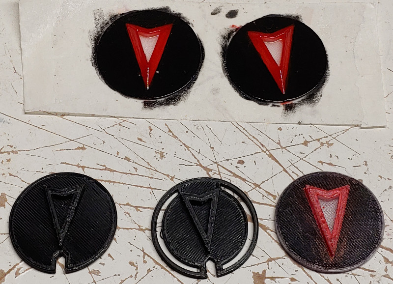 For anyone else interested in this, that translucent red paint eventually bubbled at the edges while installed in the car and I need to re-do this. I don't know if the issue is the paint reacting to the heat and sun inside the car or the plastic off-gassing (but the black paint is fine). Probably need to reprint the **** faces and choose a different paint.