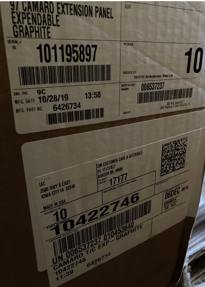 So I chased the rabit down the hole and dug up some info on these OEM panels. I found an older ebay post for the gray/graphite 97-99 panel (10422746) with the original box and manufacturer's shipping label https://www.ebay.com/itm/204468770492. Blowing up the label on the box, it appears the original supplier to GM is/was IAC North America (shipped) out of Iowa as of 2019 (https://iacgroup.com / IAC - International Automotive Components | Southfield MI | Facebook). Stands for International Automotive Components. Looks like the Iowa facility has another company in it and google points me to Texas now, but have plants all over including Michigan. They clearly have the original mold since the stamping on this panel still shows the original part number 10269102. I know it is extremely unlikely that any one of us would be able to order direct from a tier 1 supplier like this or even find out production status, but figured I'd post the info for archival sake.