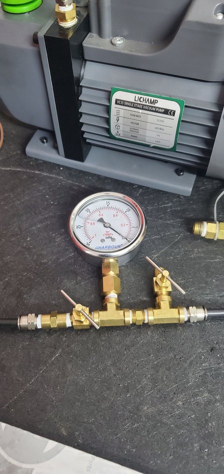 Assemble as shown in the pics. The needle valve closest to the pump I'll refer to as "main" and the one closest to the barb (the one pointed to the sky in the pics) I'll call the "bleed"