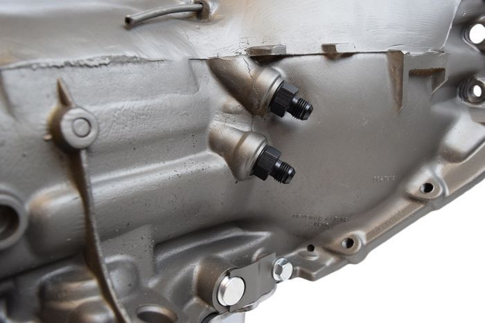 Shown above is a THM400 Case. The Cooler-Fittings are both together, near the Pump assembly, on the Passenger-Side. (Shown with Red plugs installed in the above image).