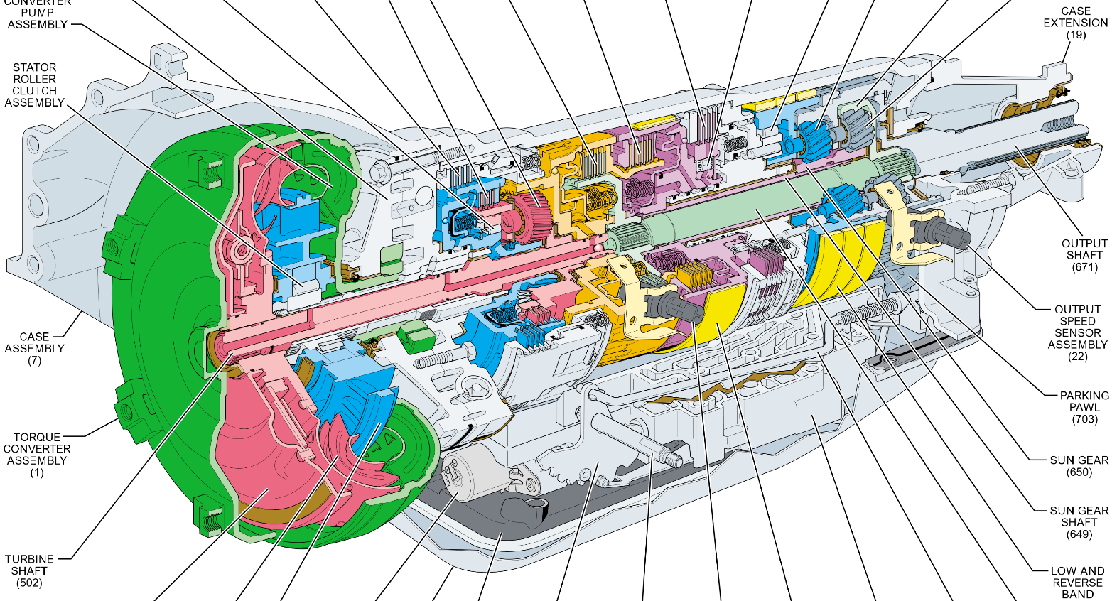 As far as the Major-Assemblies go, the Pump (in White, to the right of the Green Torque-Converter), the OverDrive Clutch assembly (in White, to the right of the Pump), the OverRun Clutch assembly (in Blue, to the right of the OverDrive Clutch assembly), the OverDrive Carrier/ Planet (in Pink, to the right of the OverRun Clutch assembly), and the OverDrive Ring-Gear on the Forward Clutch-Drum (in Yellow, to the right of the OverDrive Carrier/ Planet) are the majority of the components that differ from the THM400/ 3L80 transmission.