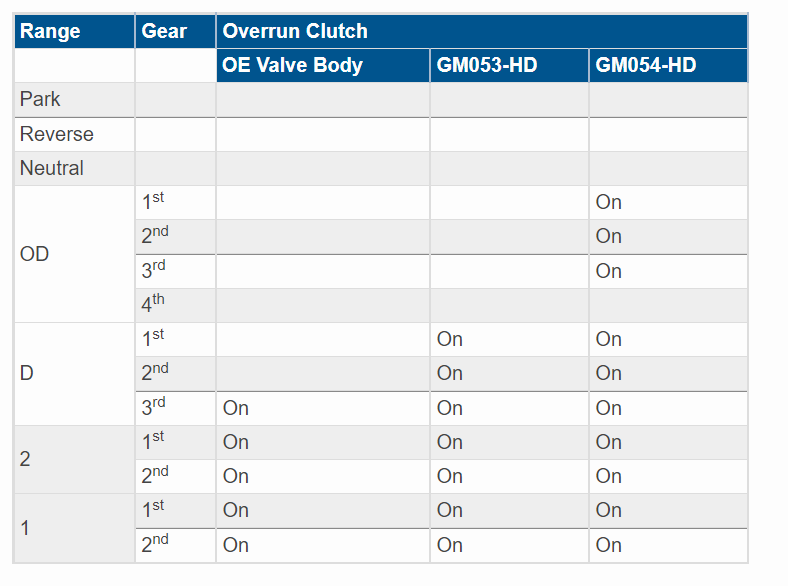 The Sonnax GM054-HD Valve-Body changes things so that the Overrun Clutch is always ON except when the Transmission is operating in 4th-Gear