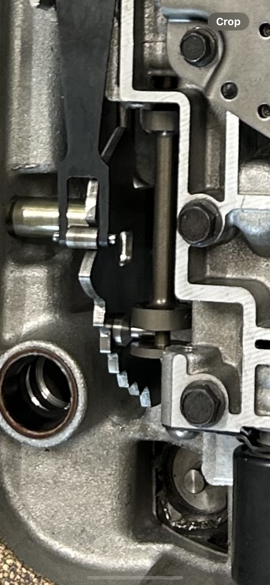 I am not saying its not there as its not clear with photo position but I do not see the nail that prevents the linkage from sliding over and the wear mark on the shaft at case would indicate that the shaft at lease in the pic is further in than it had been riding. So I the nail/retainer pin in the case? If not the linkage shaft could easily slide right over and off the manual valve even during the very first movement to gear .