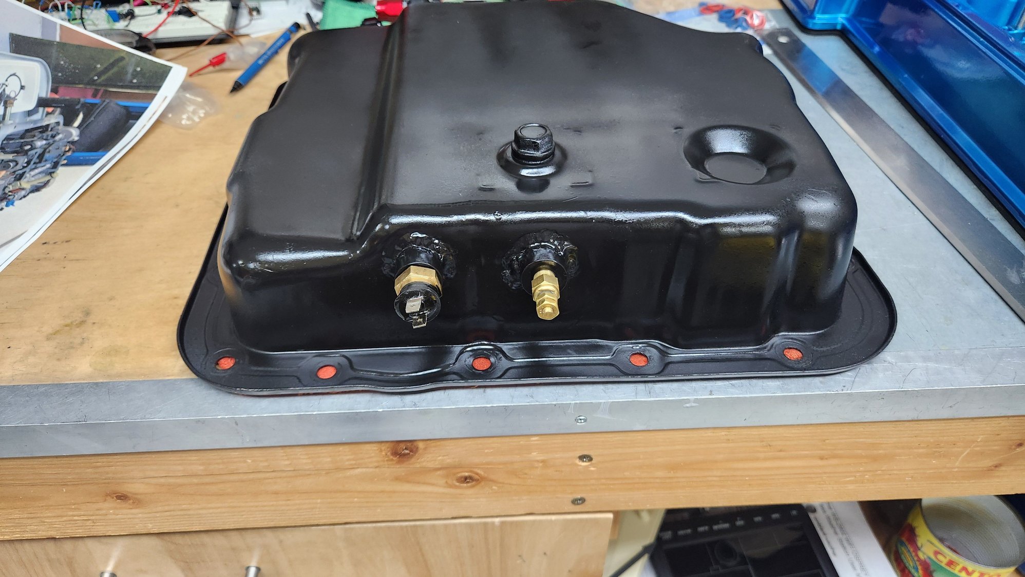 Looking at a few pics of the tranny with the pan removed the drivers side of the pan about in the middle looks like the best spot to weld in 2 bungs. One for the fan temp switch and the other for the tranny temp sensor.