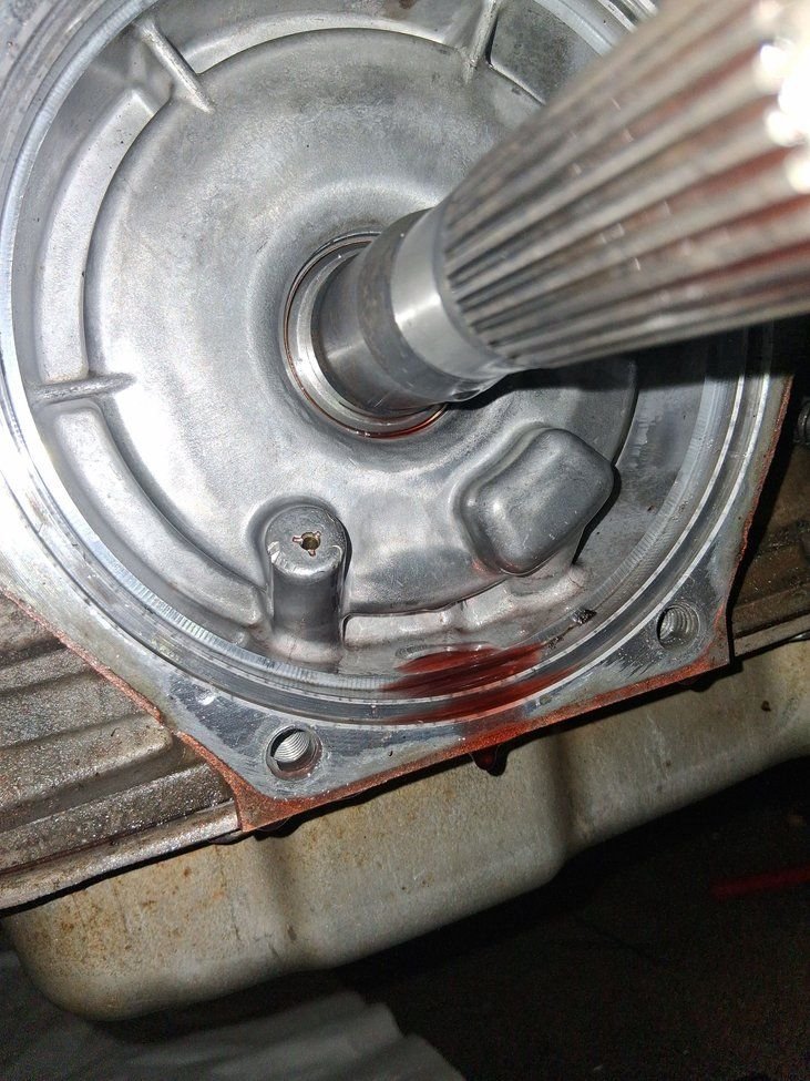 That is the drain back hole for fluid that is in the extension housing. The fluid is coming from the extension housing to case o-ring, extension housing seal or the back of trans or extension housing is cracked.