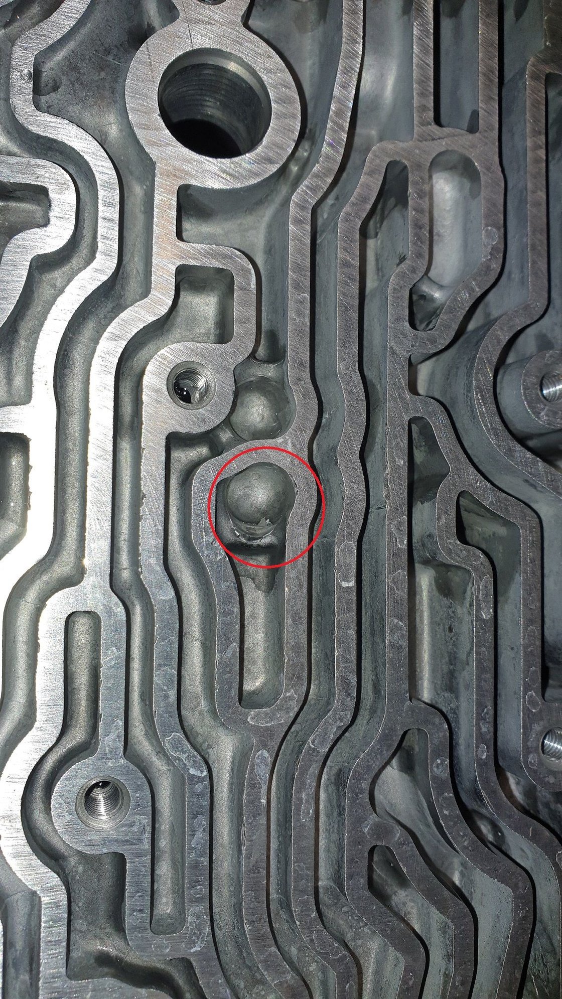 I know that Frank said to use an old check-ball to block the tube passage on the auxiliary valvebody, but knowing my luck, it would just pop out later. Instead, I tapped it and installed a 3/8" set-screw with some red Loctite.