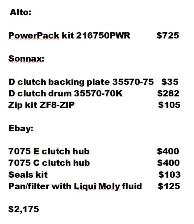 There are ridiculously expensive rebuild kits on the market for upwards of $9,000! Most have frictions & steels, a few billet drums & hubs, filter/pan.