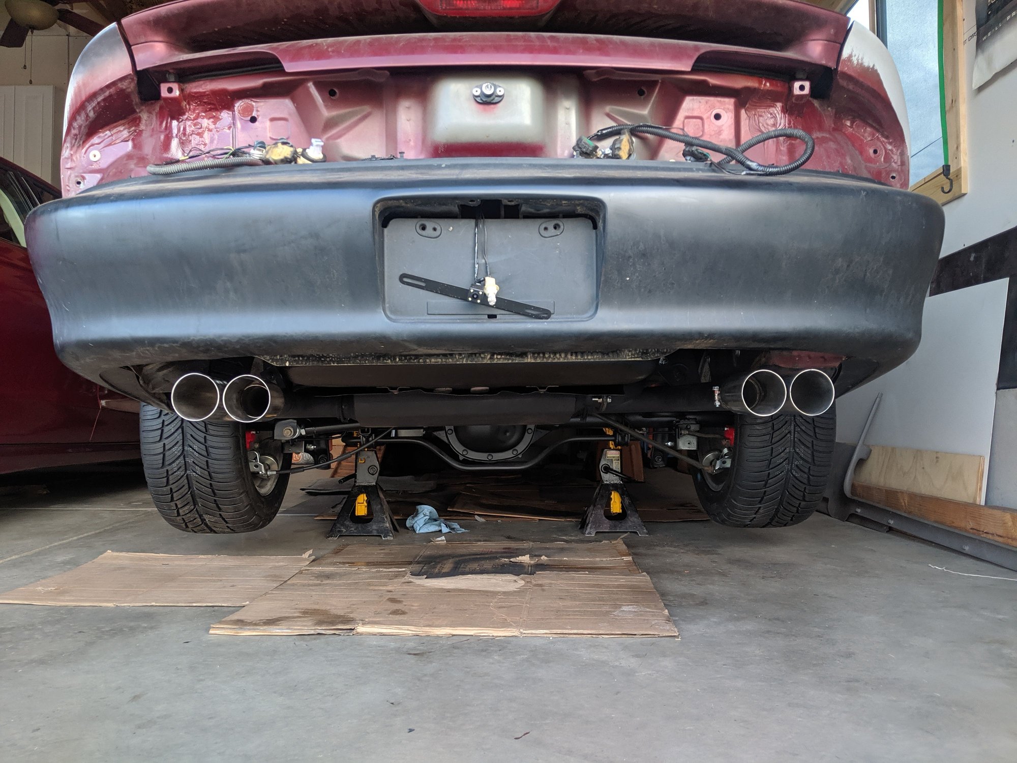 I am almost finished with the cat back exhaust system, I have everything in place and tightened down up to the tips. I decided to leave them loose for now, I need to pull the bumper cover for paint and they block two of the fasteners. Ha Ha