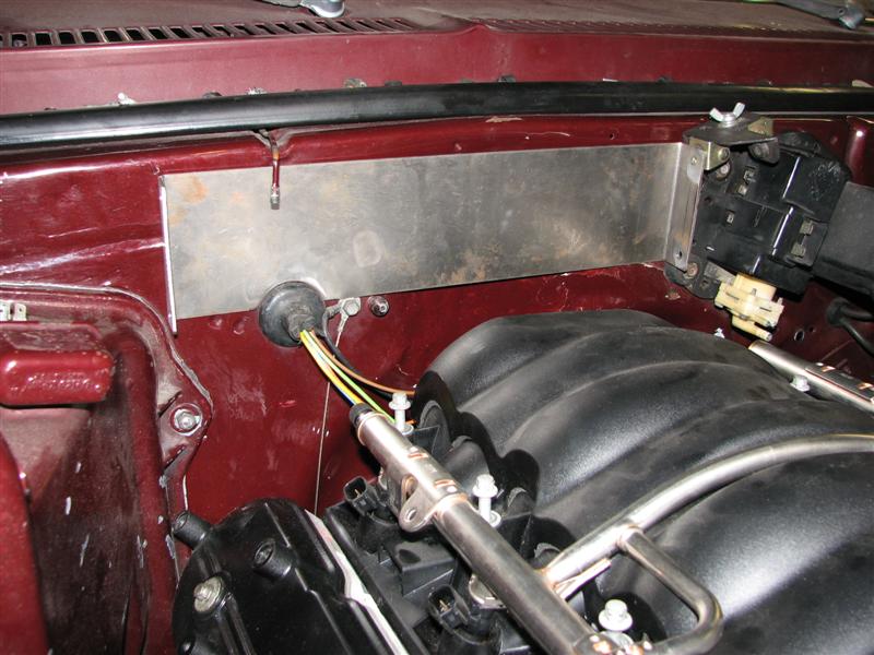 You can see above that I cut a half-moon shape out of part of the bracket to give space for my A/C & fan wiring harness to pass through. This was done with a hole saw in the mill. I don't think I need the full continuous width of this bracket. I could probably cut the middle section out and just mount the feet on either end, but the firewall in this area is dented pretty bad and it helps conceal it. I think I will keep it as a one piece bracket.