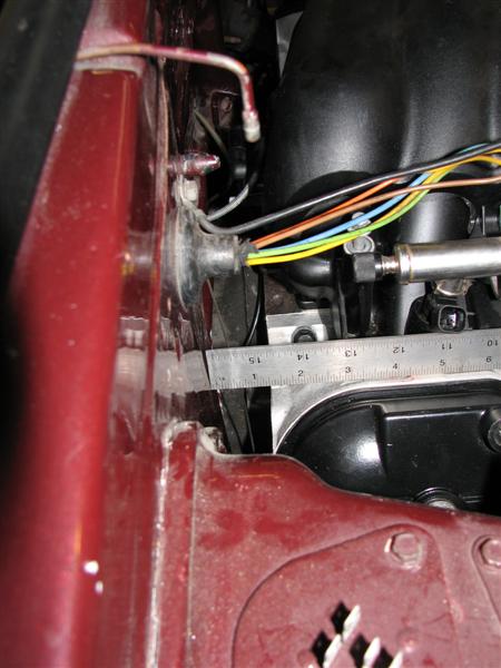 Someone asked over PM how much firewall clearance I have with the Dougs SK-100 adapters in the 1/2" setback position. Not considering the A/C suitcase, the closest is at the back of the passenger cylinder head and there is about 1-1/4" clearance. See photo below: