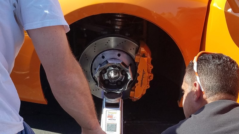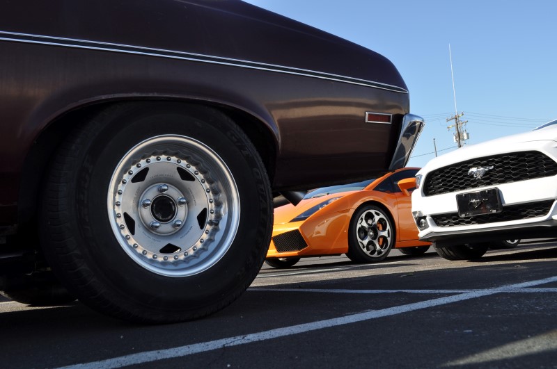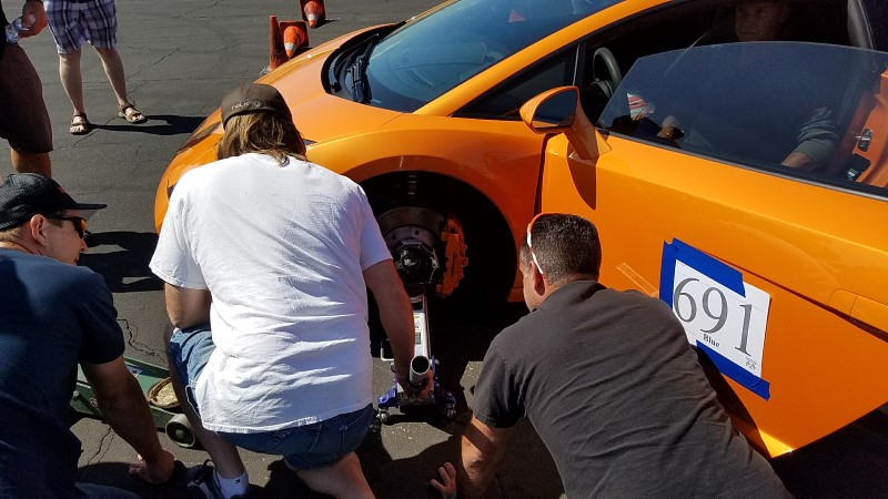 I also want to share a major fail from the day. Just after I pulled in, a bright orange '07 Lamborghini Gallardo pulled up behind me. I've always been a major fan of Lamborghinis. I even toured the factory in Italy a number of years ago. So before we moved to the grid, I snapped a few photos, including this one of my rear wheel with the front of the Lamborghini in the background. At the time I took the photo I thought it was just a cool juxtaposition of muscle vs. exotic, but it sort of foreshadowed what was to come.