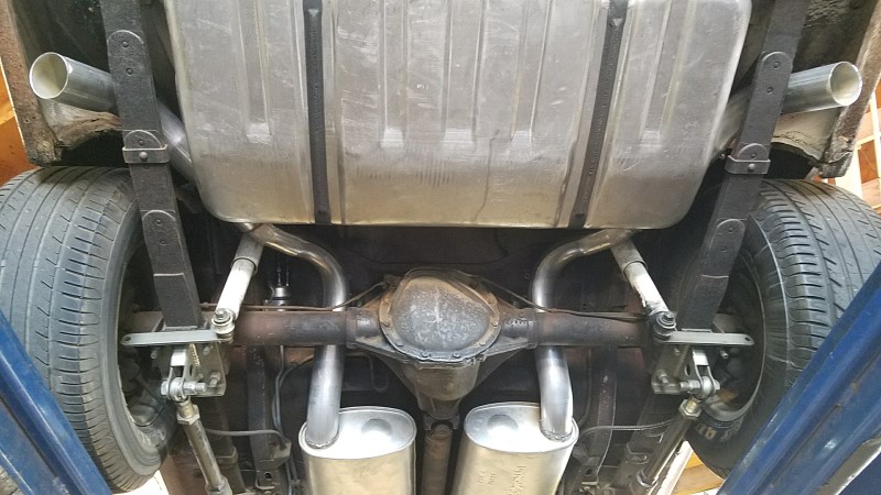 Here is what the exhaust looked like when I rolled in. I weldered it myself a few years ago using 3" mandrel bends that I cut up and spliced together. I had the Ultraflo VTs exiting directly in front of the axle. I planned to put some turndowns on there, but never got around to it.