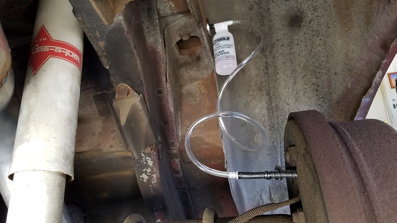 While I could technically go back and forth and check for bubbles in the hose, I made good use of my 6 year old to spot bubbles while I pumped the brakes and kept the reservoir topped off. He's always happy to help me on the car.