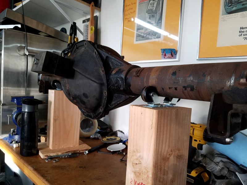 The rotisserie we came up with is a simple set of stands made from 4x6 and 3/4 plywood remnants with opposing chair casters on top. Fixed wheels might work better, but I had these on hand. I'm hopeful they are far enough from welding heat that they won't melt. I bolted a pair of heavy steel lift/lowering blocks to the diff cover to balance it and formed a crank handle from a piece of scrap aluminum. Here's a video of it in action.