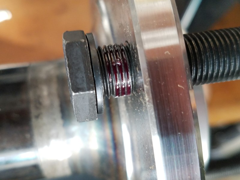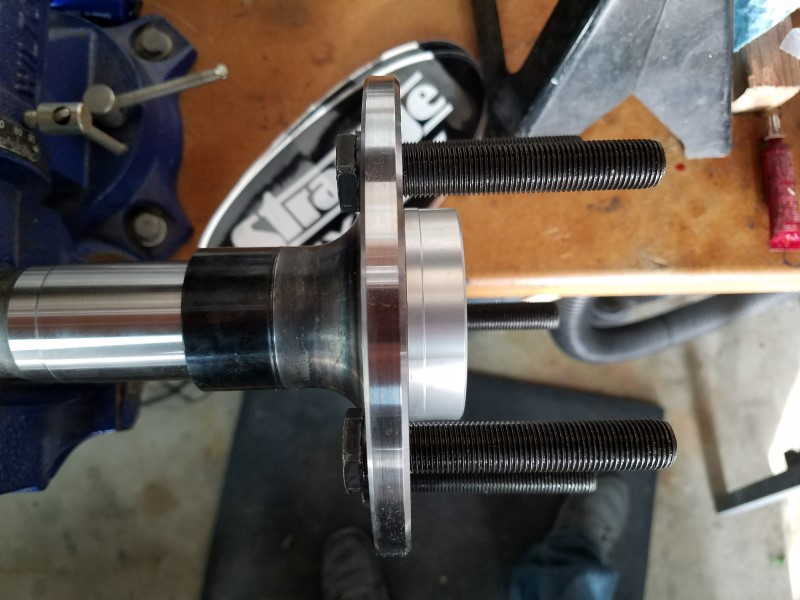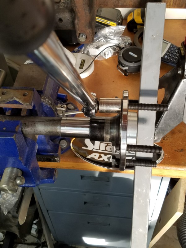 I also managed to assemble the new Strange axles. First step was installing the new 1/2" screw-in wheel studs with red Loctite and the appropriate torque. Along with the vise, I used a piece of square tubing across two studs to help resist the tightening torque. The vise alone just wasn't enough.