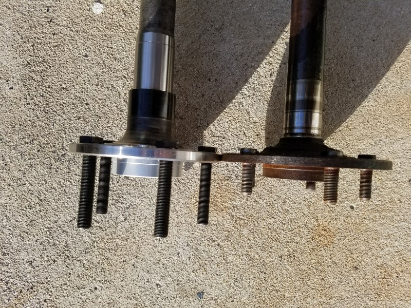 The photo below compares the stock 12bolt axle end to the Strange setup. The 1/2" studs are a little more substantial than the stock press in 7/16" studs. Also you can see the flanges are thicker than OEM and with the way the axle necks down slightly, it's likely if the axle ever does break, it will break inside of the bearing and the wheel will stay on.