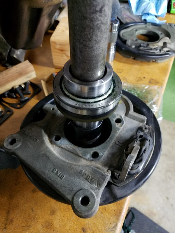 With the studs in I could move on to assembling the bearings and retaining/wedding rings. I am using the F-body brake bracket to retain the axles, so I had to put the backing plates on first, then the tapered bearing with seal, and finally the wedding ring.