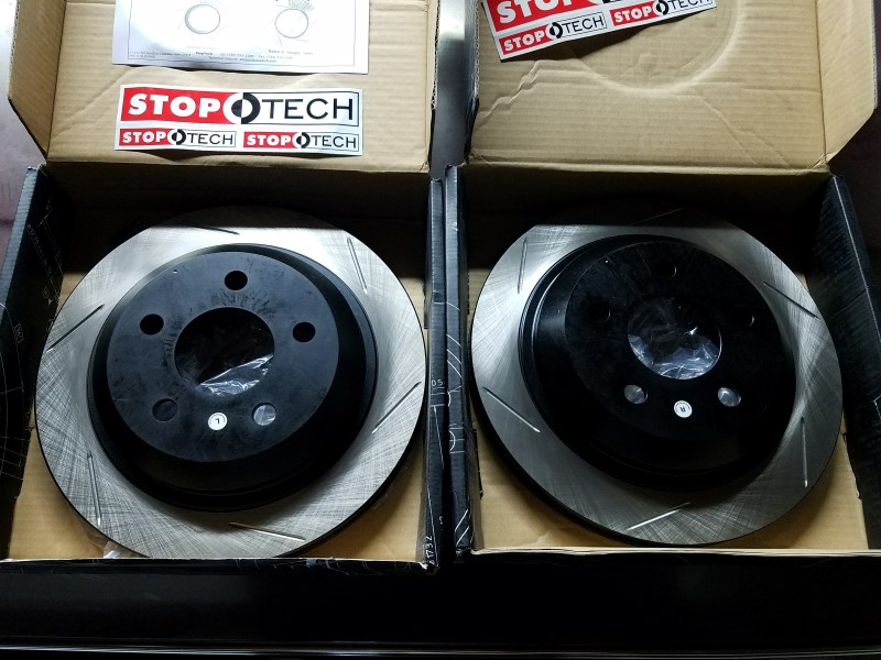More progress on the rear end. I picked up a pair of Powerslot (now Stoptech) slotted rotors for the "LS1" brake swap. They are directional vane, P/N 126.62065SL (left) and 126.62065SR (right).