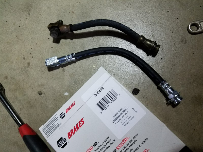 Happy with the brake mockup, I picked up some new brake hoses. The original "LS1" hoses have a 10mm banjo at the caliper and a 10mm bubble/DIN connection at the other end. I decided to swap them for '05 Blazer hoses which are a couple inches longer and have a 3/8-24 inverted flare for 3/16" tubing. They are Dorman H380469 / Napa P/N 380469 and cost about $10 each. By comparison, braided stainless lines of the same size are around $25ea.