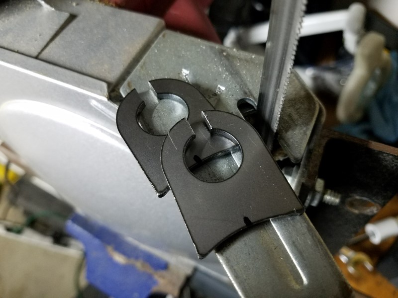 For mounting the hoses, I picked up some precut tabs for Currie CE-6013-TAB. They didn't have a slot for removing the brakeline, so cut a slot with my bandsaw. This will allow me to remove the brake lines from the axle without opening up the brake system, so i can just hang the calipers and lines from the car if I want to remove the rear end - no bleeding needed.
