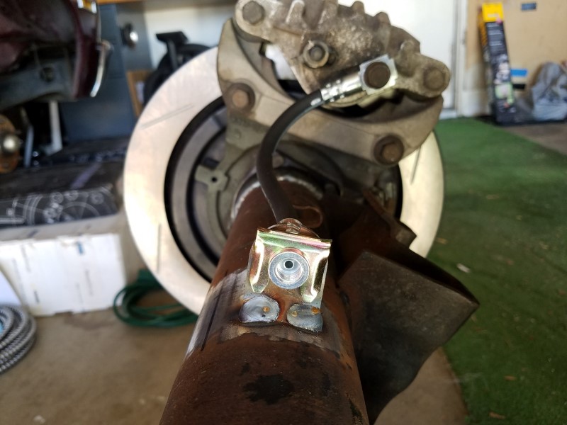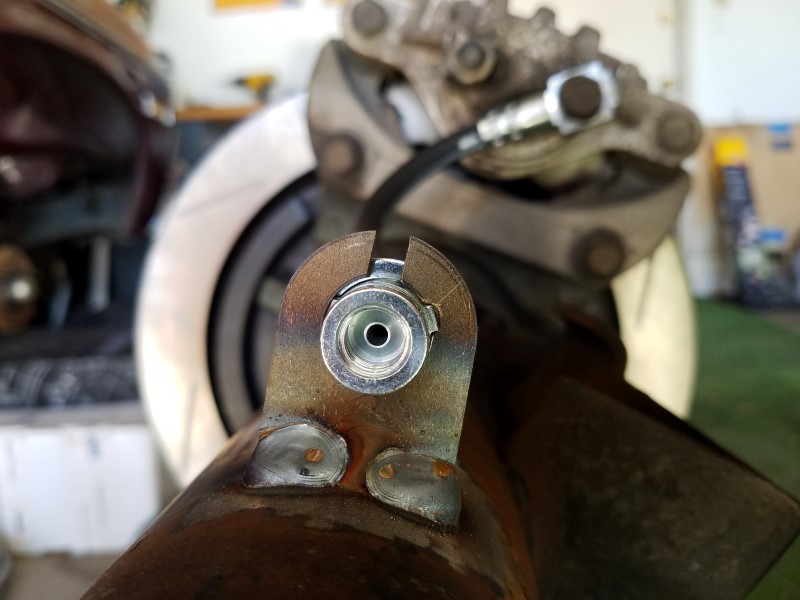 Once I figured out where I wanted them, I used a Dremel and a carbide cutter to make a notch for the anti-rotation tab. Then I tacked and finally welded them on. I used Allstar brake line clips ALL50150 to retain the hoses lines.