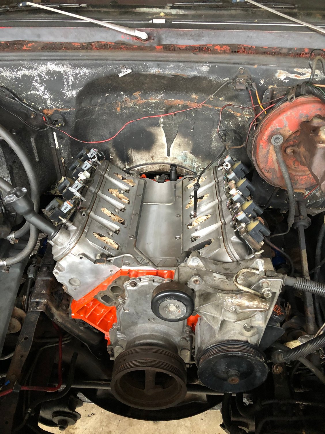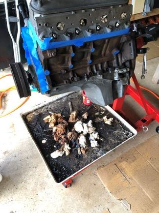 After picking it up from VA Beach I drove it all the way to Arkansas a few months later. No gauges except the oil pressure work, it breaks up once you get into the secondaries. It has the worst bump steer I have ever personally witnessed and trust me when I say I have driven some real junk and this joker has made me respect its authority. It was so bad that when I was driving from my dads in Northwest Arkansas to North central Arkansas in the mountains it would change lanes. For anyone who has ben in that part of the country there are alot of roads that are still narrow and have no where to go when you get in trouble. This monster on a down hill left handed sweeper at 80 hit a bump and put me into on coming traffic down hill. Now why are you going 80 down hill in the mountains in a **** box? The 305 that could has a holley 600 that cant and so to keep out of the secondaries I took all advantages of down hills to get up speed ( if you know then you know). Anyway I digress, here are some of the pictures of the Gen 3 5.3 I grabbed and did a corona and 4 loko rebuild on. It has an SS2 cam, Pac spings, with a new oil pump. Other then that I didn't touch it. I did commit the ultimate sin and checked the cam bearings but they were good.