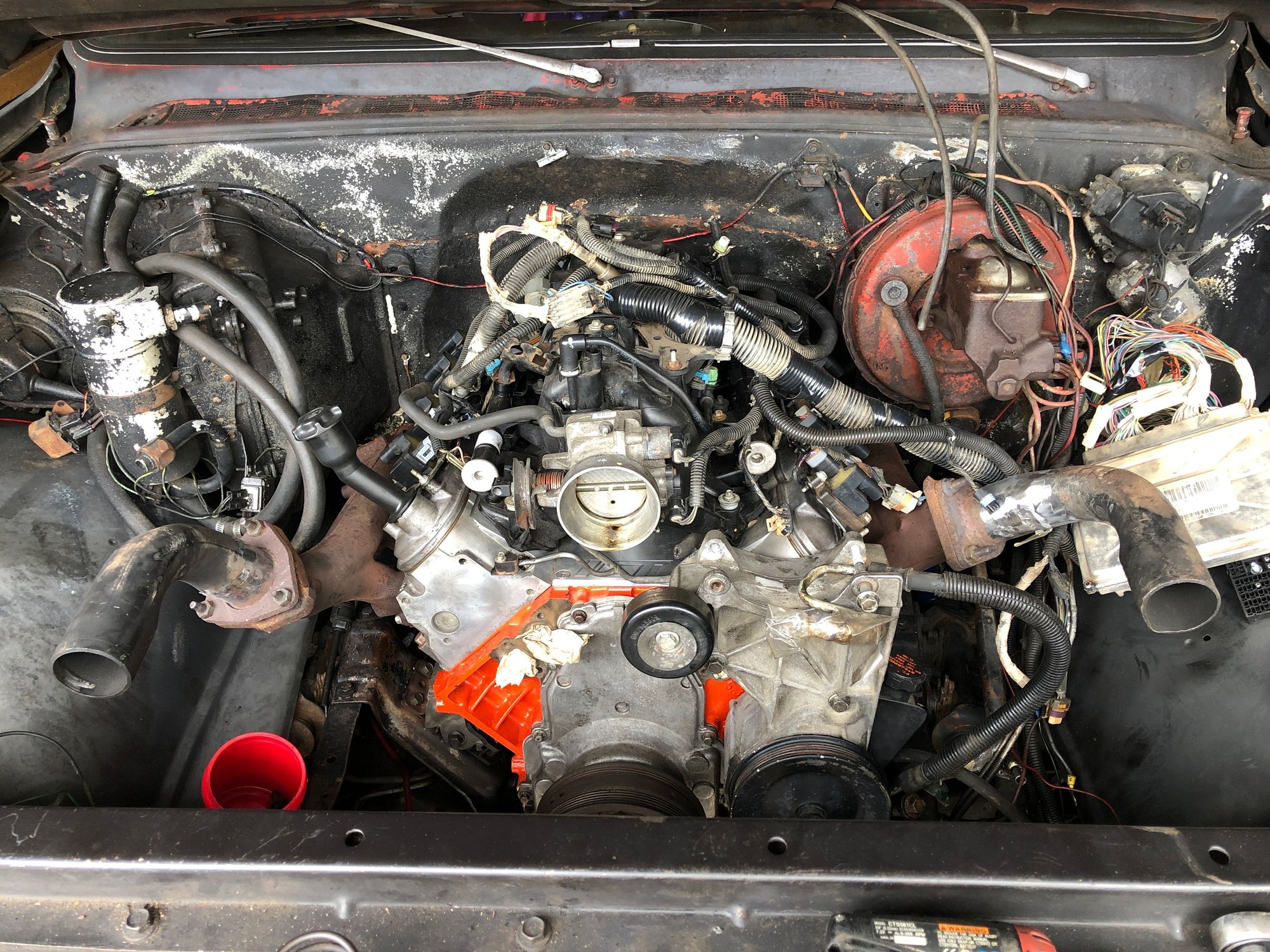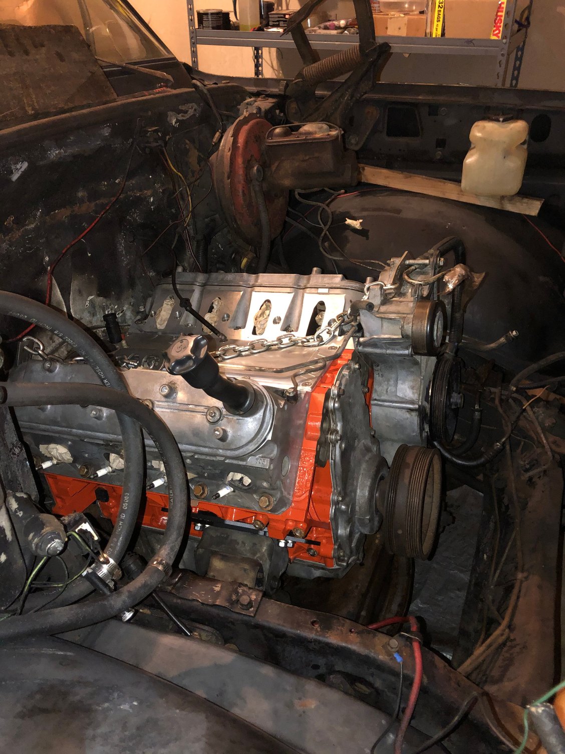 Motor is in, but me being me I forgot to oblong the holes for the converter. I’m running the th350 for now which coupled with this cam and a stock converter should make for a crappy driving experience. I’ll upgrade to 4l80 later this year. 3rd problem is the trans crossmember is for a single exhaust and won’t work with the exhaust I have. Soooo new crossmember is in the works.