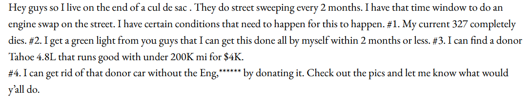 I would go bigger than the 4.8 you mention in post #5. that impala is a large chunk of metal. if sticking naturally aspirated, I would go 6.0 or 6.2 from a low mileage donor. as stated above, unless you get a low mileage drivelline, plan on rebuilding the motor. your HAMB post has it as a 200k motor. that is getting into core motor/trans territory. and I wouldnt spend more than $700 for a core motor and trans. $4k for a truck with a 4.8 with 200k is about $3k more than you should need to spend.