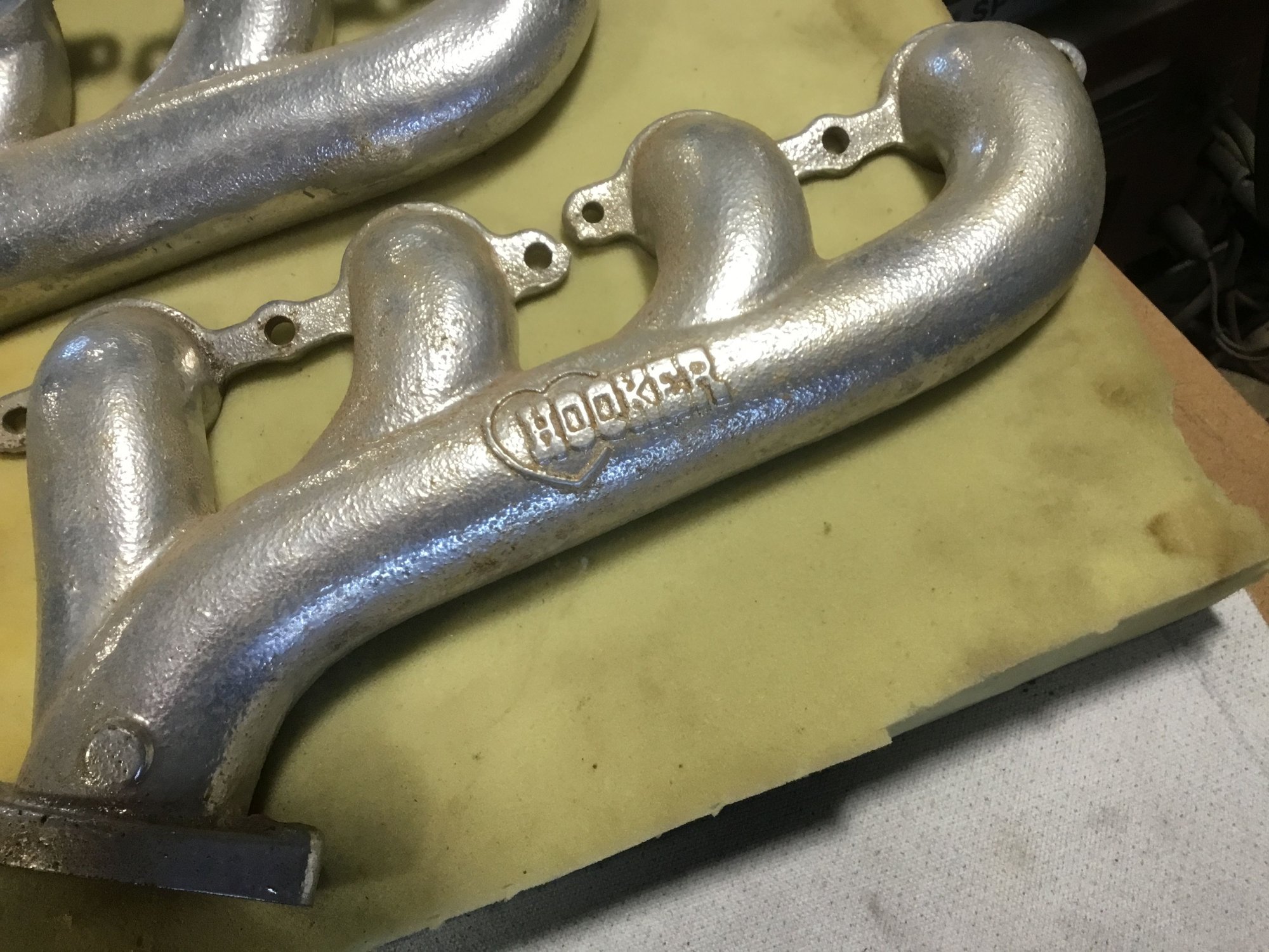 Some pictures of my Hooker LS swap manifolds. As you can see they are very well made and fit my Cutlass perfectly. These are the ceramic silver coated version, as you can see they are rusting from under the coating. Two years old and never run, never gotten wet or exposed to the elements. I found out Hooker has a 90 day warranty on the coating. These are the original type with 2 1/4" outlets. Now you also get 2 1/2" Seems like they would have made them 3 inch to start like Speedway did on their stainless steel cast LS manifolds.