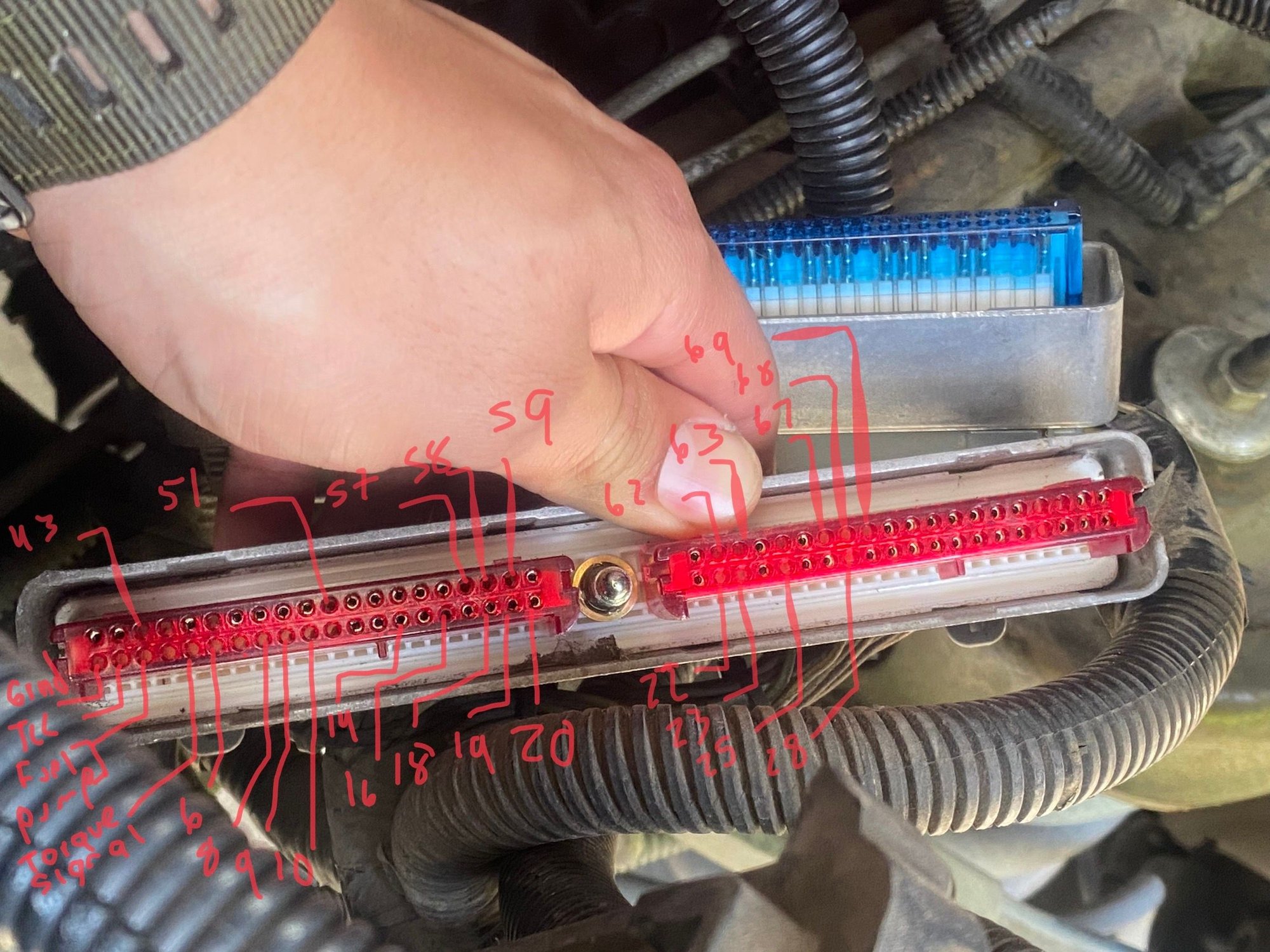Can anyone confirm If I’m missing some pins, more on the red side of the connector. 2001 Chevy Silverado 1500 2WHD 5.3 LS. I ran OBD 2 and I have about 40 codes all related to the harness. Camshaft, 4WHD, Knock sensors, all four H02S and a misfire. They all appear right after I delete codes. Original owner since dealer back in ‘04 first time running scan tool. Other than that she runs we’ll never noticed a difference lately.
