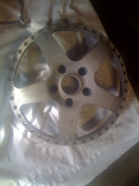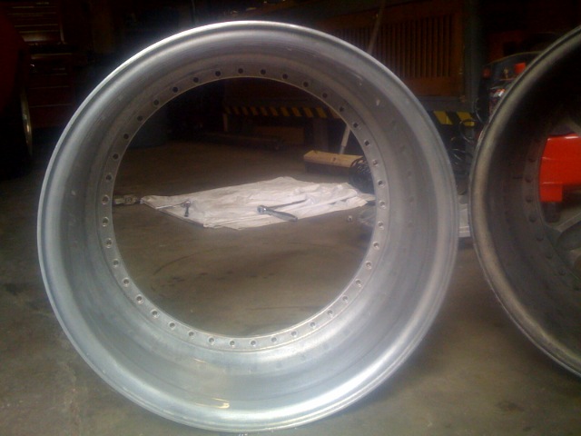 The outer lips were once polished but have since dulled. Not very pretty at all. The centers look OK but I want a slightly different look. There are 40 bolt around the circumference of the wheel. Once the bolts are taken out, the center separates from the inner and outer rim.