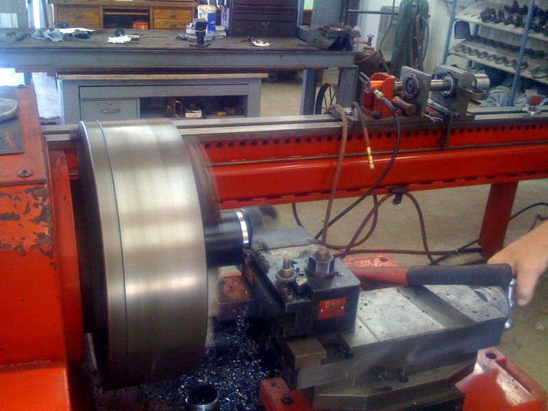 The first thing that Terry did was slide my old driveshaft into a big lathe and cut off the old weld yokes. This was not nearly as dramatic as I thought it might be.