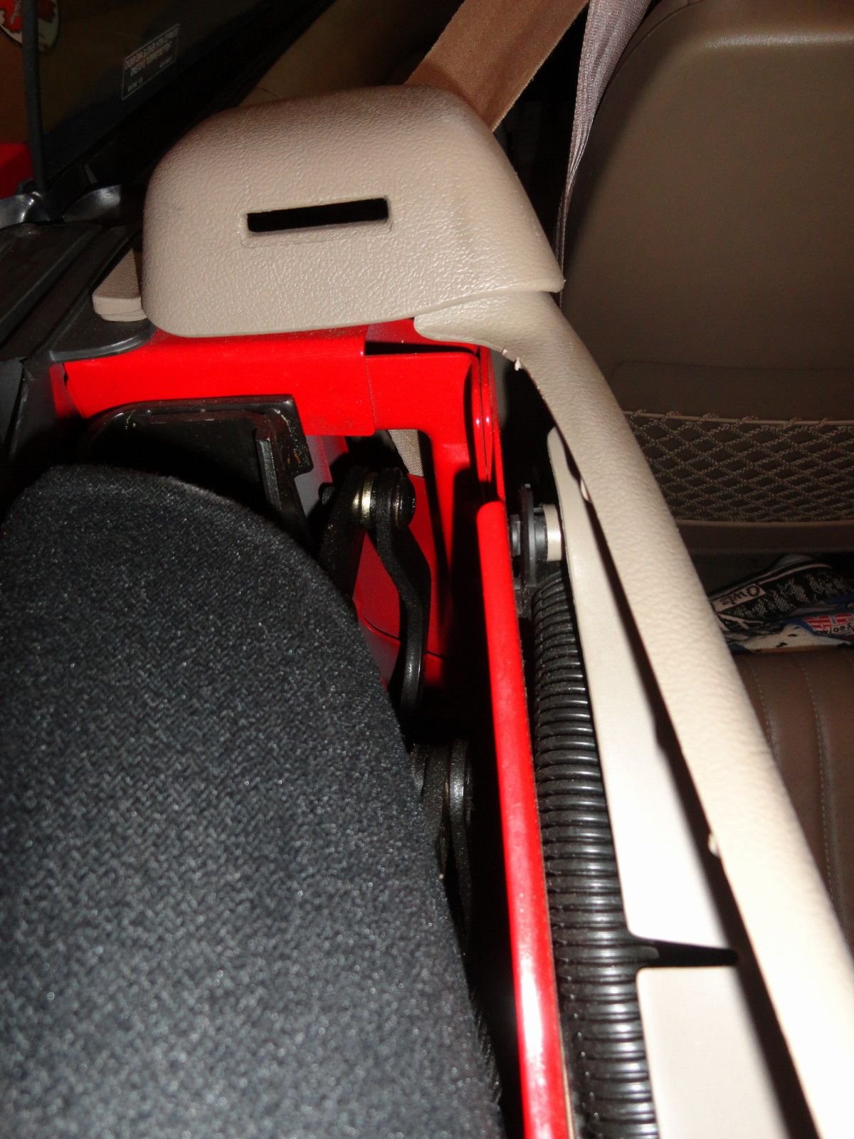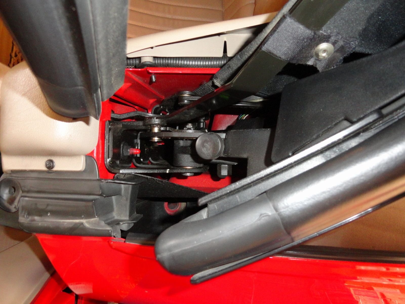 Perhaps start with both latches up front. This area is hidden a bit but you can access with a long spout oil can or spray. You can see all the moving parts and where they need to be oiled. Another angle This is with the top partially 'up'. It won't hurt the mechanism for a short period. You can see more areas to oil. See the paper towel underneath? Easy to place there and catch the extra oil drops. The car still smells a bit afterwards but will air out.