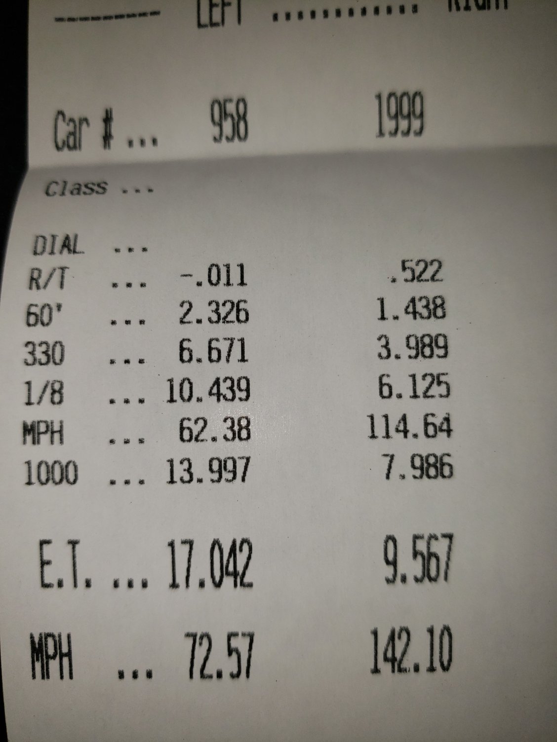 Car currently runs 9.567 at 142.10. With 3.25 gears on 28x10.50s. Car kind of seams like a dog on the back half 1/8 to 1/4. I plan on turning it up a little more this year. Goal in 150 mph in the 8s. Build is the normal 99 z28 5.3 ss2 cam, th400 4k stall, 80mm t6 turb on e85. Can't tell you my exact rpm when crossing the finish line. But wondering if going to 3.50s or 3.70s would help or even be worth it.