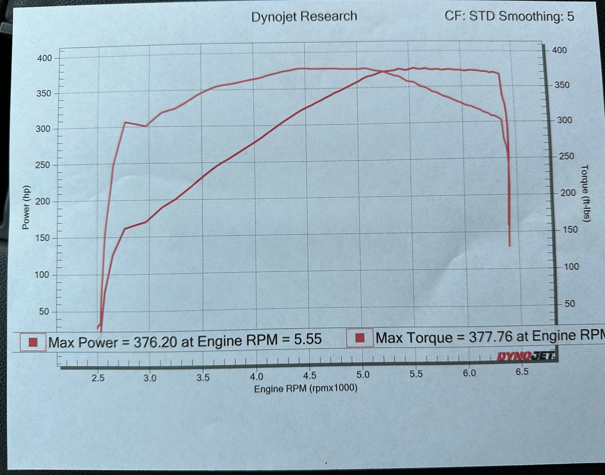 Truck has 377 hp/tq with a nice torque cure and the HP peaks at 5500 and only lost 7hp at 6500.