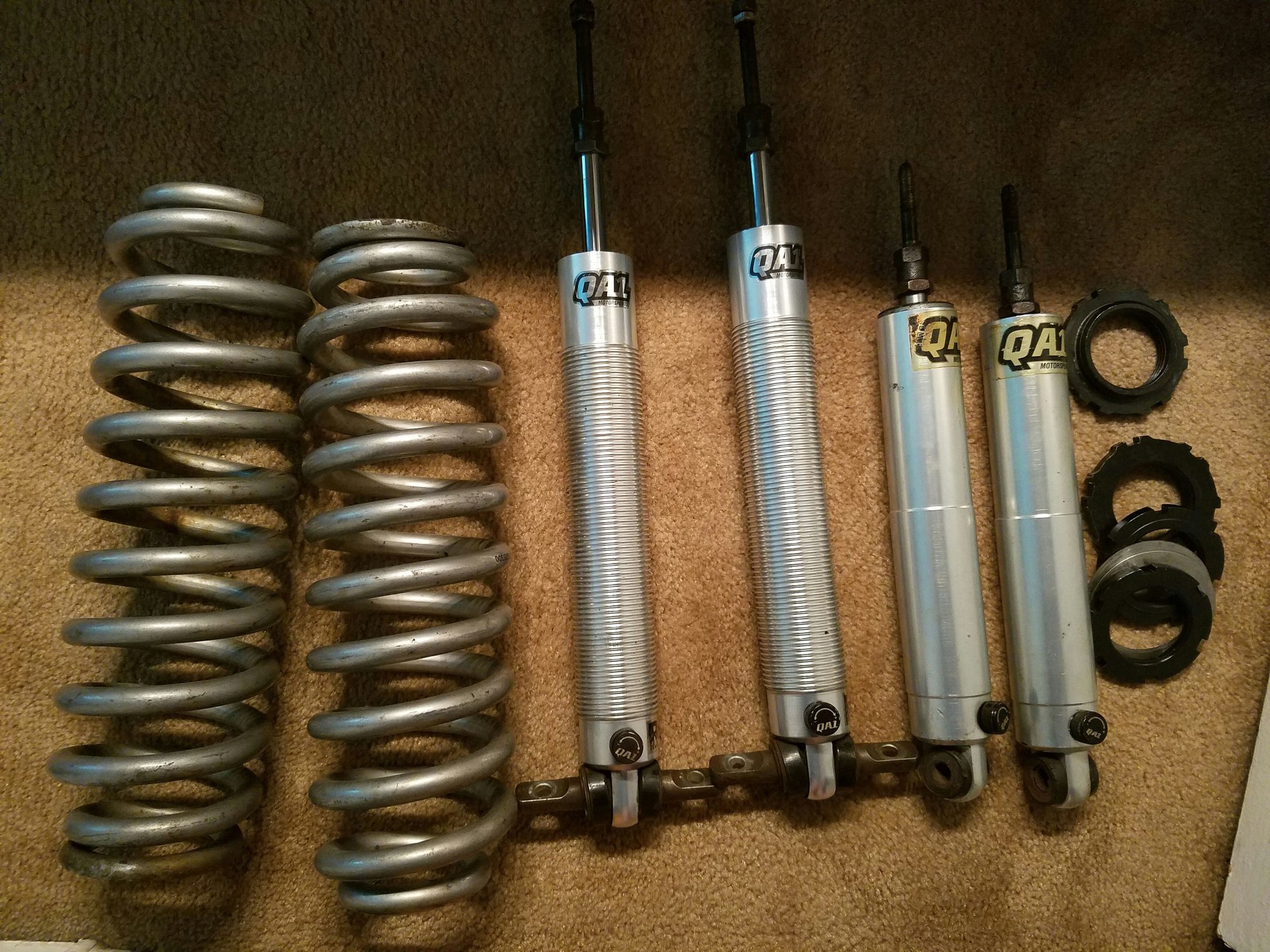 I have qa1 shocks and springs, taken off the car 7 or so years ago, had them on the car for 3 or so years. They all need to be rebuilt (new seals and oil)... The fronts are the R-series and the rears are the gen f both single adjustable.. I have 300lb springs with them... The only thing i dont have is the spanner wrench for the shocks but thats easy to get.. Im in edison nj.