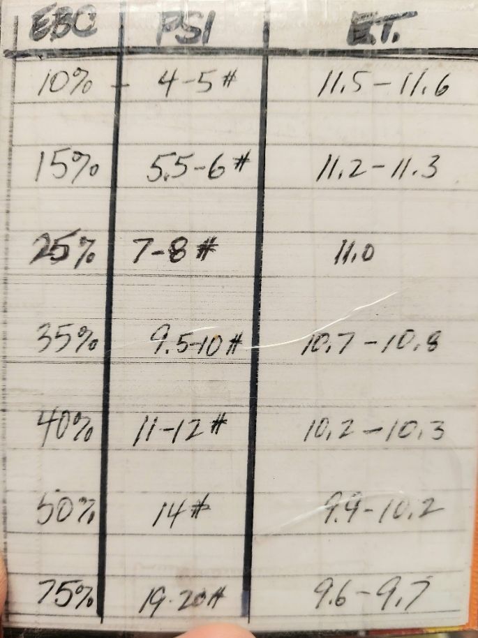 I datalog every pass and made myself a little laminated "cheat sheet", which tells me (pretty closely) what % to set my controller at, for a specific amount of boost, and ET (footbraking). I can pretty closely dial in anywhere from mid 11's to mid 9's, and anywhere in between, and may try some 10.0 Index class racing this year, so I 100% get what you want to do.