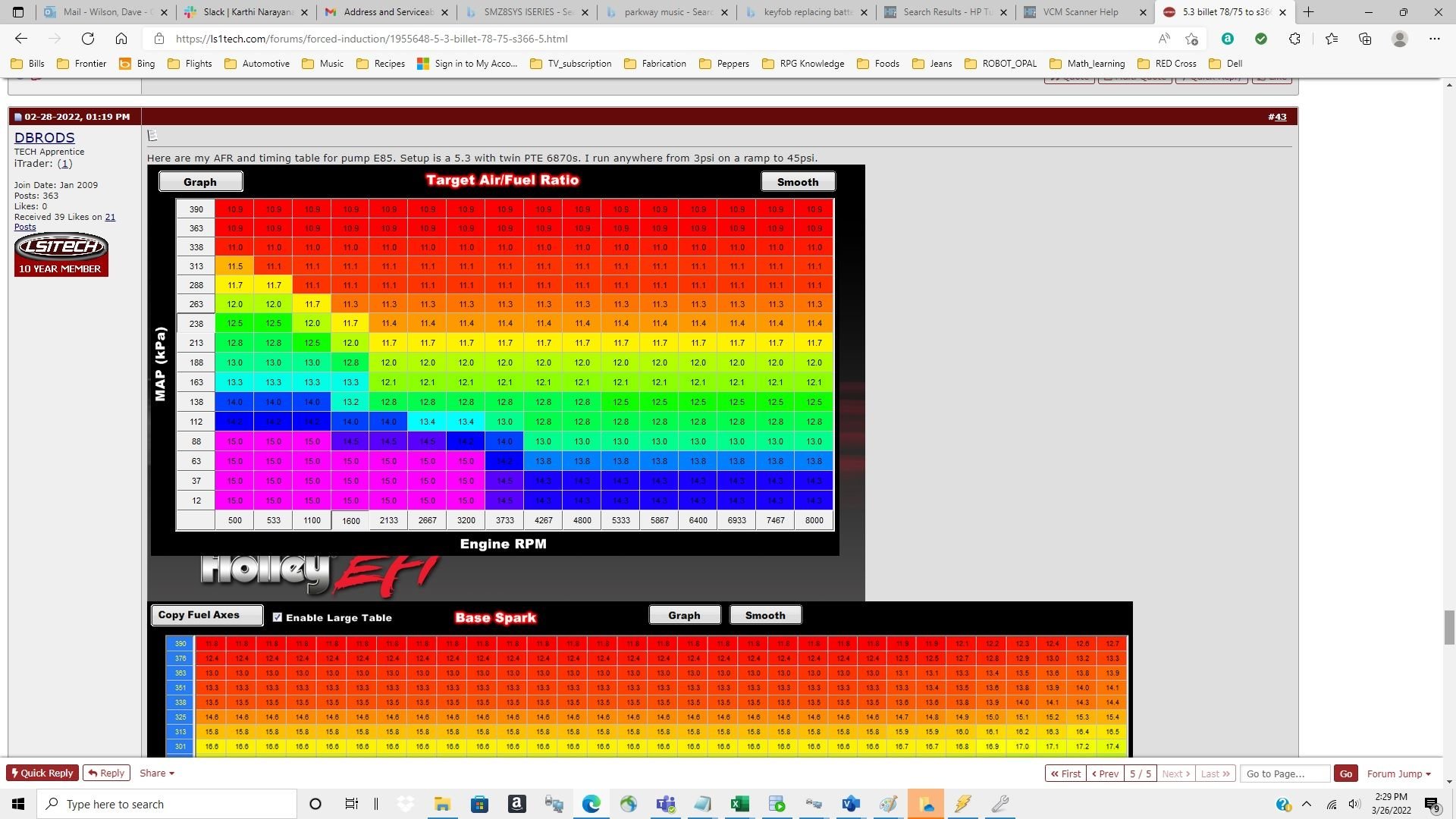 I was, as usual, just spot checking different threads in the Forced Induction forum a week or two ago and there was a discussion about a topic (the name of which escapes me now and hence, the reason I'm posting this thread) that touched on some timing setups some of you good people were using. One of the respondents, I cant remember his user name but he has red pickup truck in his signature, posted some of his Holley Terminator timing setting via screen shots. I've been running E85 for the past several years but haven't really done much on the spark tables, tending to focus more on the VE tuning with my HPTuners. While looking at this gents timing, I thought, "wow. .. .that's all super aggressive, compared to mine". The Holley X, Y axis is based of the KPA and RPM axis, while HPTuners uses Cylinder AirMass vs RPM. I pulled one of my more lengthy scans down into a spreadsheet and ran some analytics on the data to try to correlate the KPA of the scan to the rows associated cylinder air mass. After I had that, I hand typed in the screen shots KPA/RPM from the holley into a separate spreadsheet. Then I created some code in PL/SQL to match them up as well as I could to represent what's in the HPTuners rows and columns. I had to be a little creative to fill in the RPM columns because Holley, rather than using 200 or 400 RPM increments, has uneven breaks like 267,533,1067, 1333, etc. On those, I just averaged between the HPtuners columns that incompassed the Holley columns. At any rate, I then created a spreadsheet to receive the current HPTuners spark table, the Holley based timing setup, a set of columns from the scanners spark logging, then a section that contained potential revisions. The logic in that section first compares the scanner/log output to see if that cylair/rpm cell was hit, if so, it checks to see if the Holley derived cylair/RPM cell is of a higher value that my current tunes cylair/RPM value. If it is, in adds 1 to the current tunes cell value. This new value appears in the 'revised' section. If the test is 'not true', then the original cell value from the current tune appears. I then upload the revised tune to my PCM, take a test drive , logging the drive and then repeating the process.