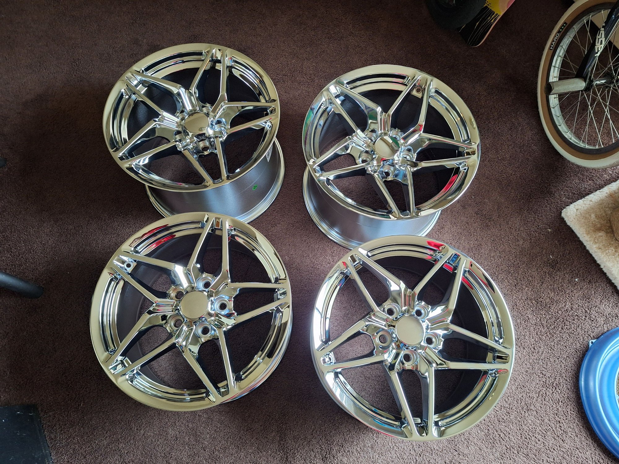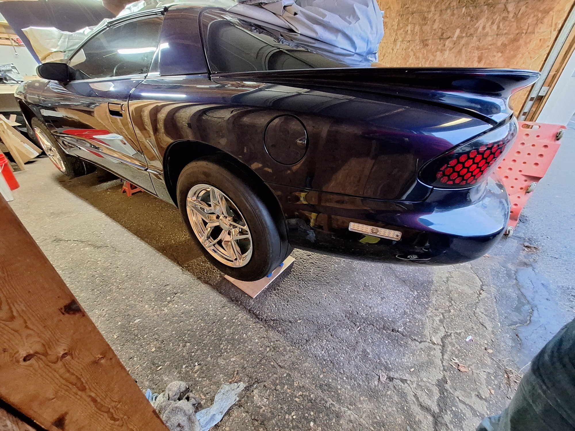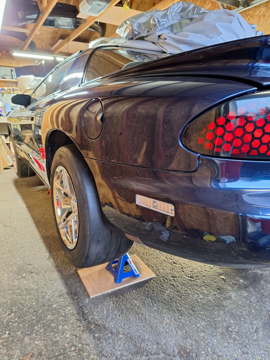 Finally got my power steering leak fixed, so I was able to get it back on the ground for a bit. My fab guy made me a nice bracket to mount a wheel speed sensor, so I installed that and ran the wiring up into the engine bay. Also got my second boost solenoid plumbed, as well as another solenoid I'm using for a CO2 powered exhaust cut out. Filled my CO2 bottle and I'm happy to report that nothing leaked when I tested it. Started using Deutsch connectors for my sensor/solenoid wiring and I gotta say, they are cake compared to Metripack connectors. I'm soon going to start on fully redoing my Holley wiring, as I need to move a few things around and add some sensors, some of which I've gotta wait to install. No big deal, I'll run the wiring and it'll be ready to go when I get them in. Pulled her out of the garage to move to my other, larger garage, and snapped a couple of shots sitting on the new rolling stock. I gotta say, it looks pretty wicked now! Unfortunately, the driver's side was rubbing a bit. Missed a spot with the hammer, so I'll be doing more clearancing tomorrow.