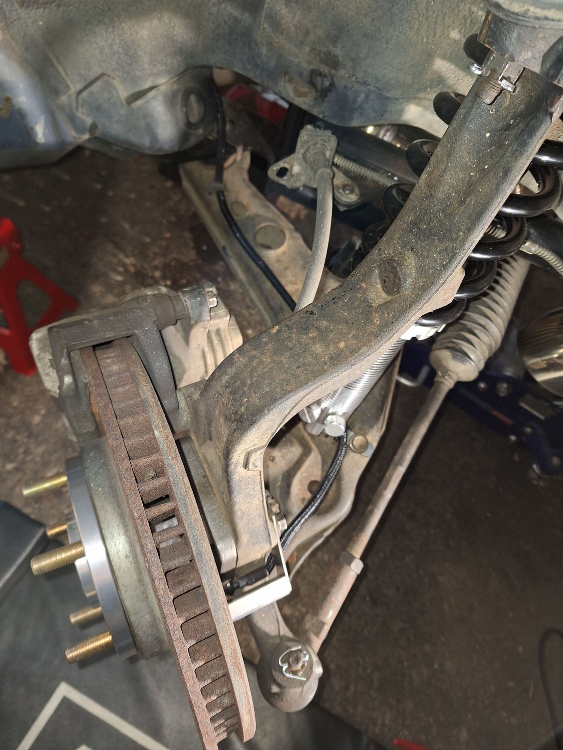 Finally got my power steering leak fixed, so I was able to get it back on the ground for a bit. My fab guy made me a nice bracket to mount a wheel speed sensor, so I installed that and ran the wiring up into the engine bay.